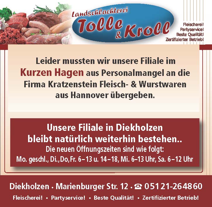 Die traditionell, handwerkliche Herstellung von delikaten Fleisch- und Wurstwaren ist unsere Passion, der wir schon seit 1915 folgen und die uns dahin geführt hat, wo wir heute sind. Im Laufe der Zeit haben wir unser Angebot erheblich erweitert. Viele neue Produkte und ein umfangreicher Partyservice sind hinzugekommen. Besuchen Sie uns gern in unseren Filialen in Diekholzen oder Hildesheim und genießen Sie den feinen Geschmack unserer frischen Fleisch- und Wurstprodukte.